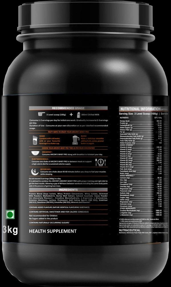Gaining lean muscle mass and size can be very challenging especially when you have a fast metabolism or find it difficult to consume enough calories and protein during the day, ARCON’S WHEY PRO is a high-quality mass gainer that is loaded with L-Arginine, L-Glutamine, Creatine and other nutrients to help you achieve your daily goals in lean mass gaining. ARCON’S WHEY PRO has a blend of digestive enzymes, dietary fibers vitamins and minerals that further helps you in achieving balanced nutrition. The fast acting carb content in ARCON’S WHEY PRO helps in driving the insulin cycle, in turn pushing the amino acids to the muscles there by helping with muscle building and recovery.